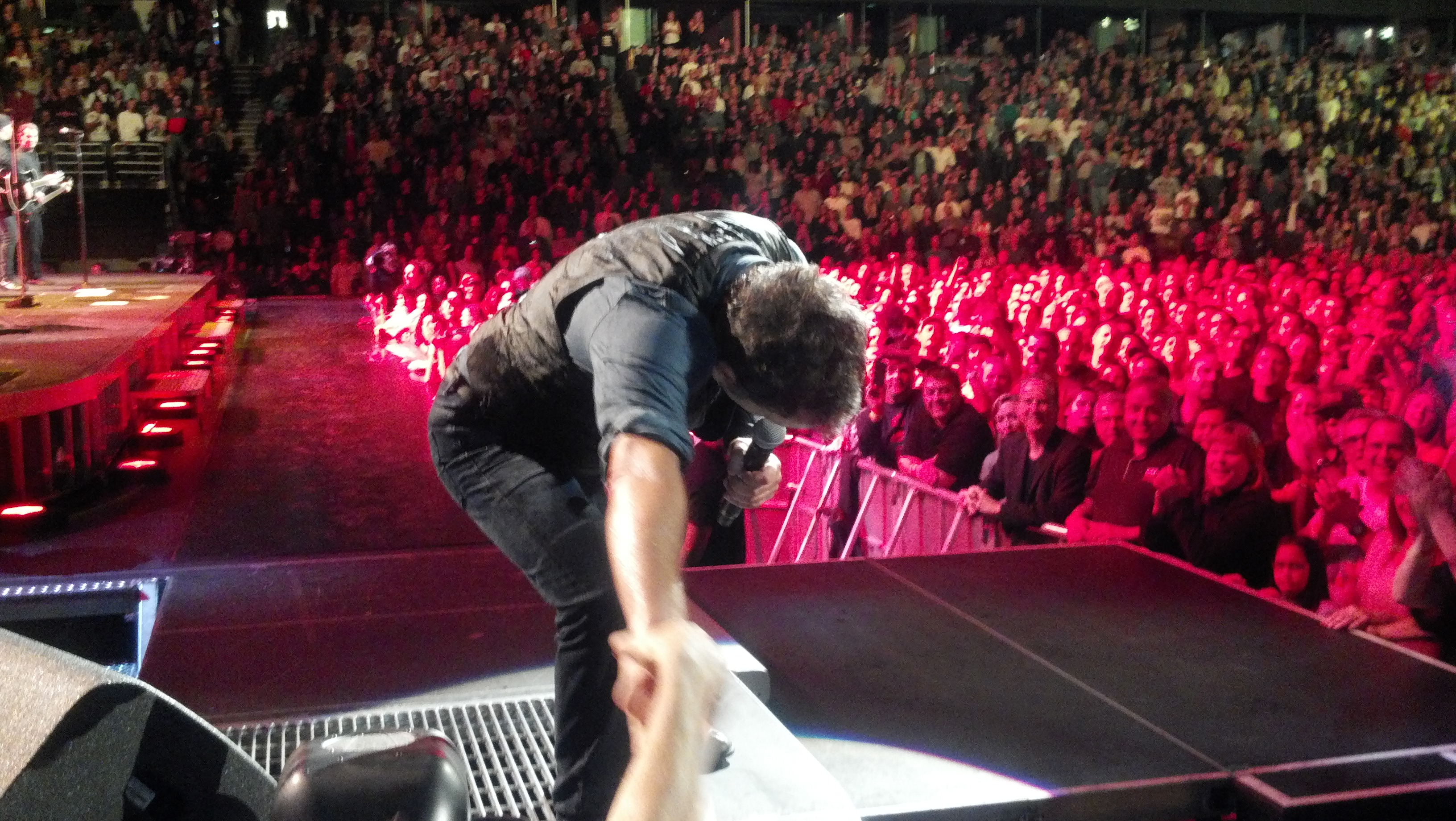 Skip ahead to the recent December show in Anaheim, and some veterans observed that Springsteen was moving a wee bit slower, and more cautiously. He still prowled the entire multi-level stage, but his domain was more constrained. Nonetheless, he enthusiastically crowd surfed and embraced a setlist extending past the three hour mark. The band was sonically as crisp as ever, but it seemed that Steve Van Zandt only perked up when frequent guest Tom Morello delivered some zinging guitar fretwork. Nils Lofgren was able to stretch out with an extended solo in “Because The Night,” his angular guitar chords matching his acrobatic footwork.