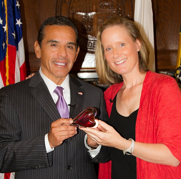 AWBW Founder and Executive Director Cathy Salser presents Los Angeles Mayor Antonio Villaraigosa with the organization’s first ever heART Award